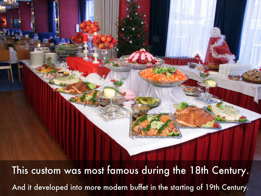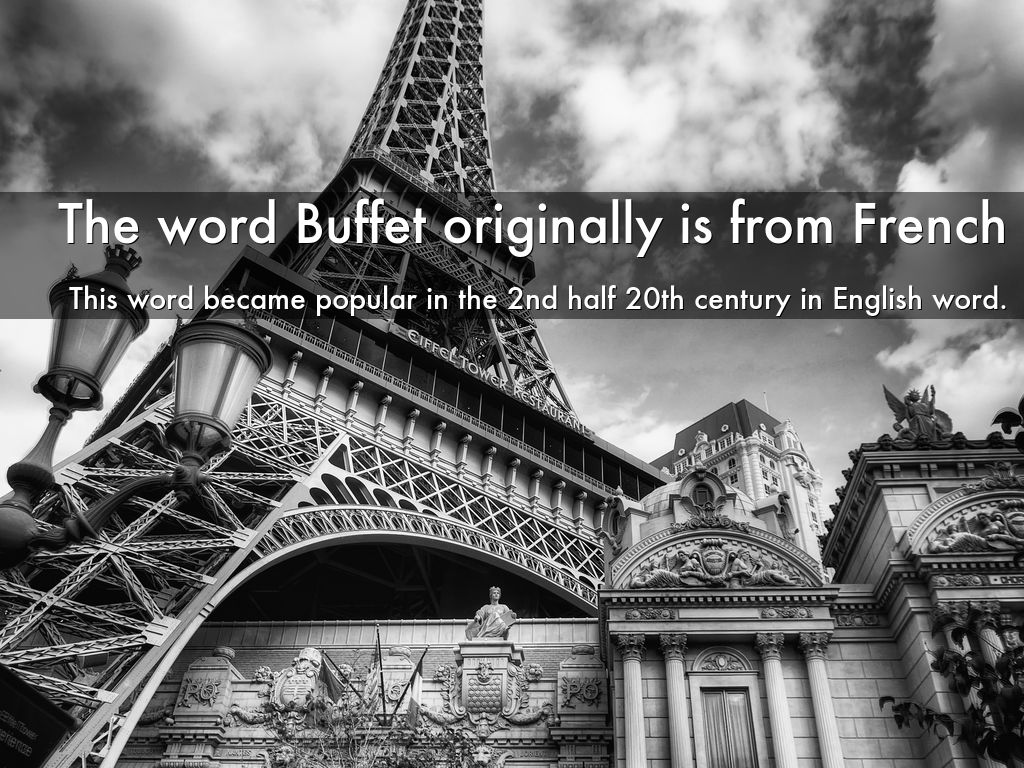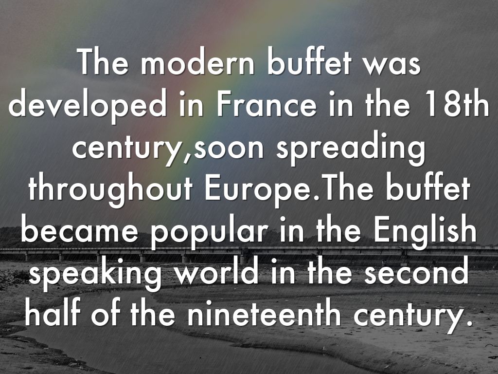 The modern buffet was developed in France in the 18th century,soon spreading throughout Europe.The buffet became popular in the English speaking world in the second half of the nineteenth century.