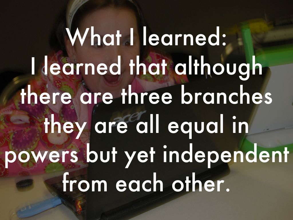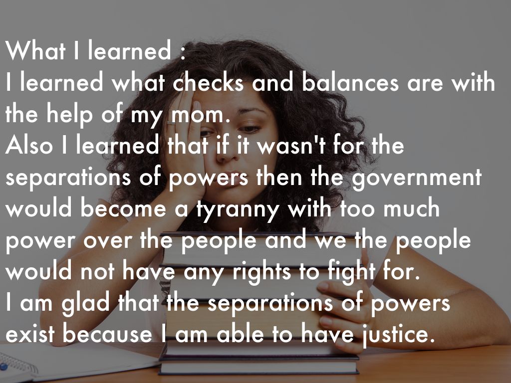 What I learned : I learned what checks and balances are with the help of my mom. Also I learned that if it wasn't for the separations of powers then the government would become a tyranny with too much power over the people and we the people would not have any rights to fight for. I am glad that the separations of powers exist because I am able to have justice.