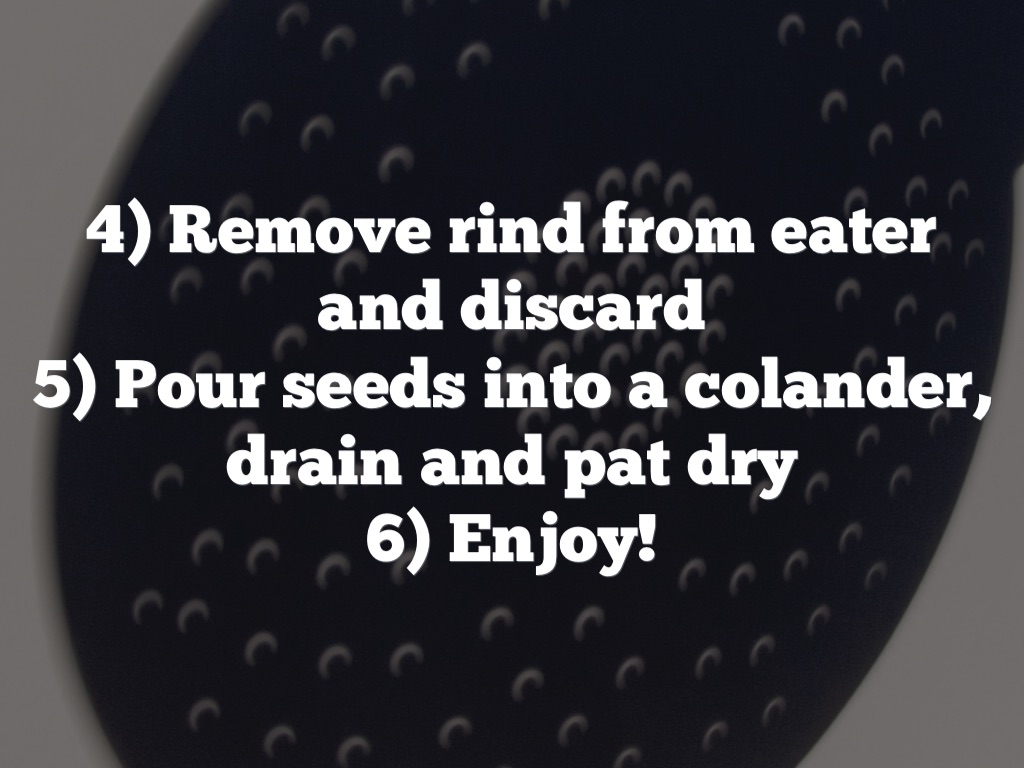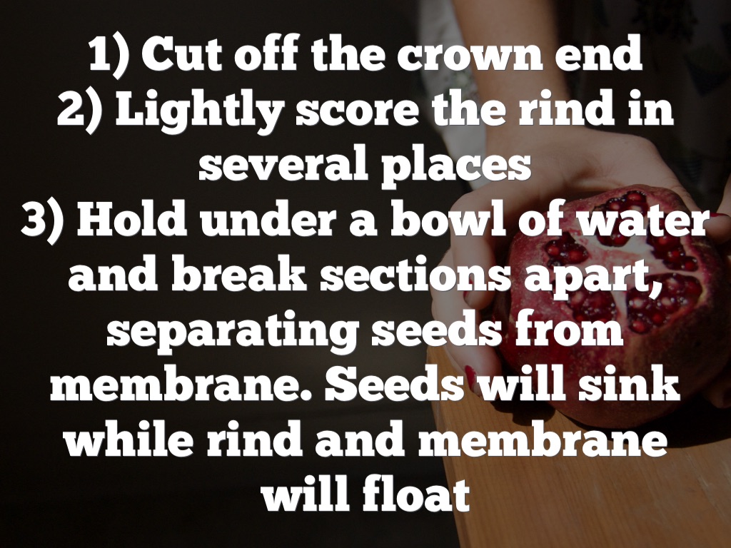 1) Cut off the crown end 2) Lightly score the rind in several places 3) Hold under a bowl of water and break sections apart, separating seeds from membrane. Seeds will sink while rind and membrane will float
