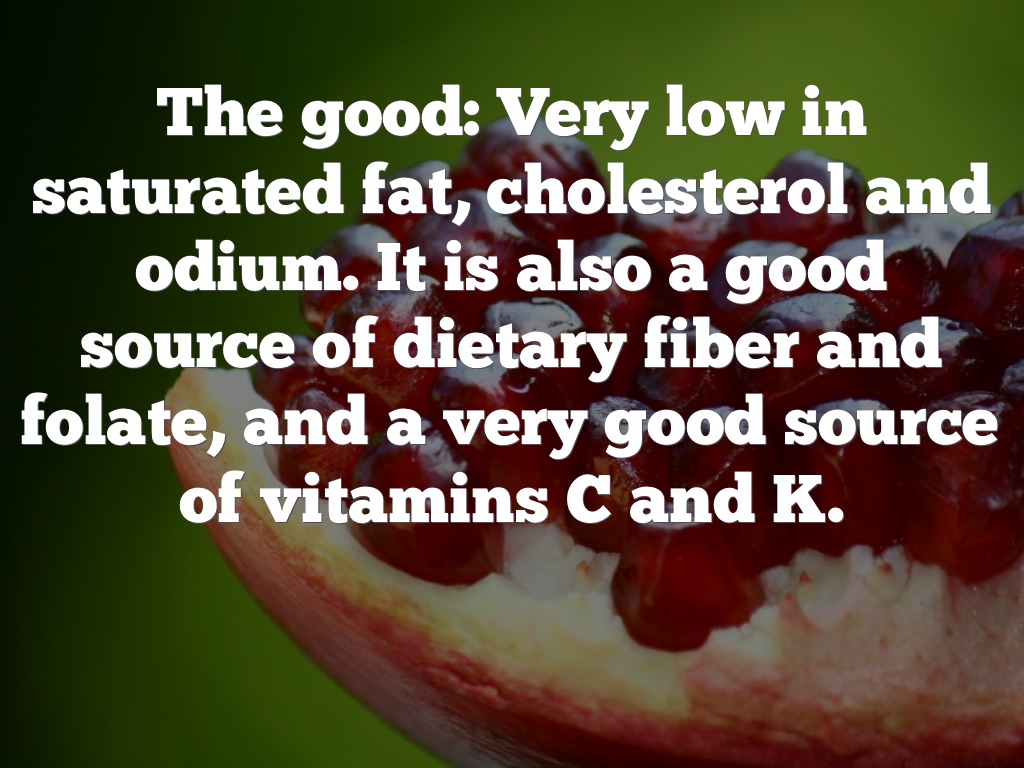 The good: Very low in saturated fat, cholesterol and odium. It is also a good source of dietary fiber and folate, and a very good source of vitamins C and K.