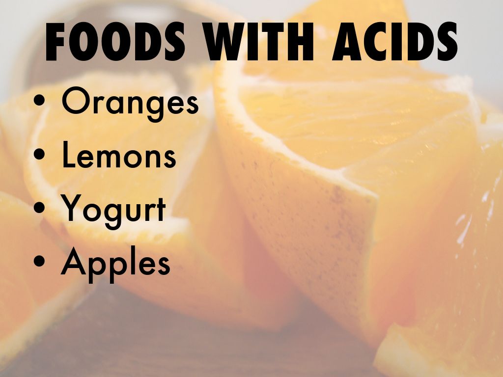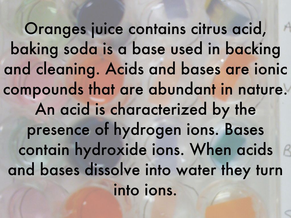Oranges juice contains citrus acid, baking soda is a base used in backing and cleaning. Acids and bases are ionic compounds that are abundant in nature.