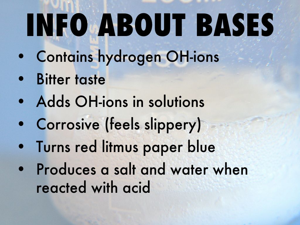 An acid is characterized by the presence of hydrogen ions. Bases contain hydroxide ions. When acids and bases dissolve into water they turn into ions.