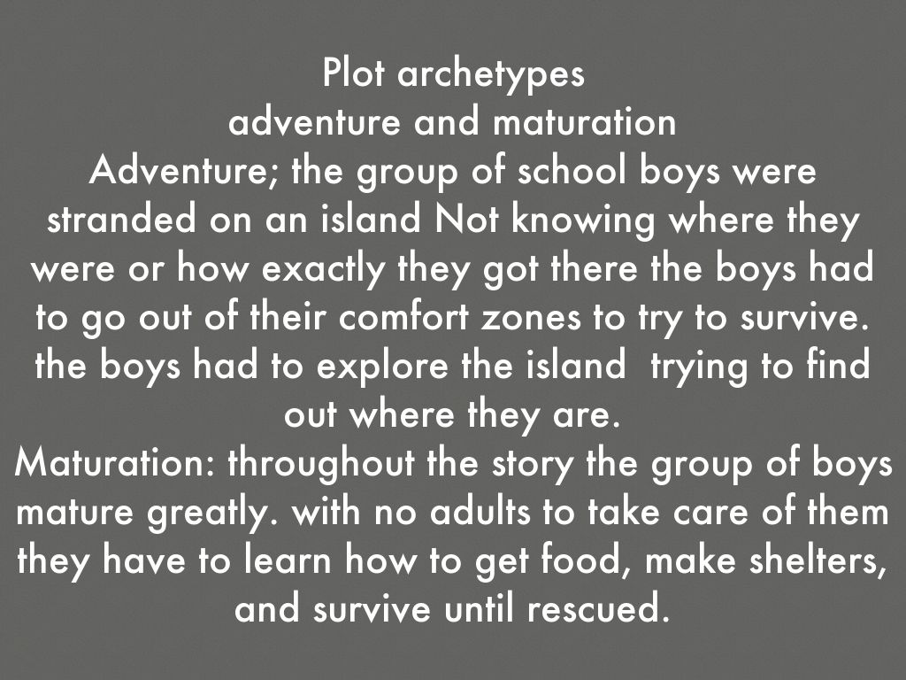 Maturation: throughout the story the group of boys mature greatly. with no adults to take care of them they have to learn how to get food, make shelters, and survive until rescued.