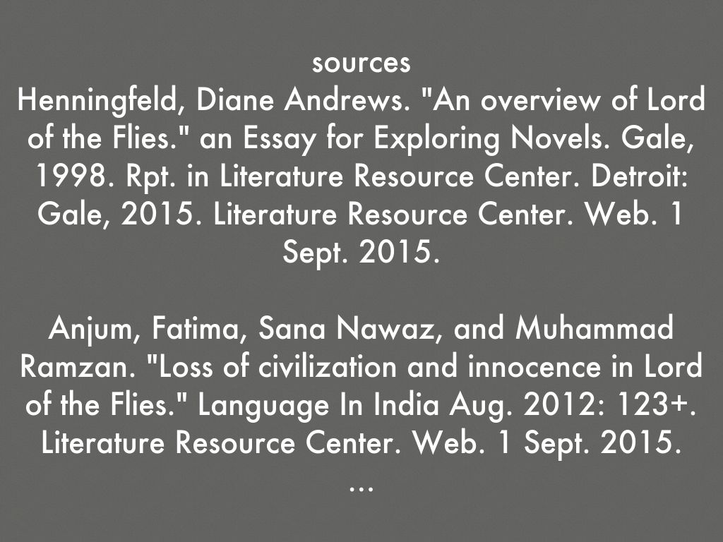 Anjum, Fatima, Sana Nawaz, and Muhammad Ramzan. "Loss of civilization and innocence in Lord of the Flies." Language In India Aug. 2012: 123+. Literature Resource Center. Web. 1 Sept. 2015.