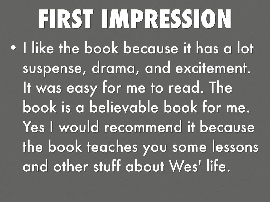 • I like the book because it has a lot suspense, drama, and excitement. It was easy for me to read. The book is a believable book for me. Yes I would recommend it because the book teaches you some lessons and other stuff about Wes' life.
