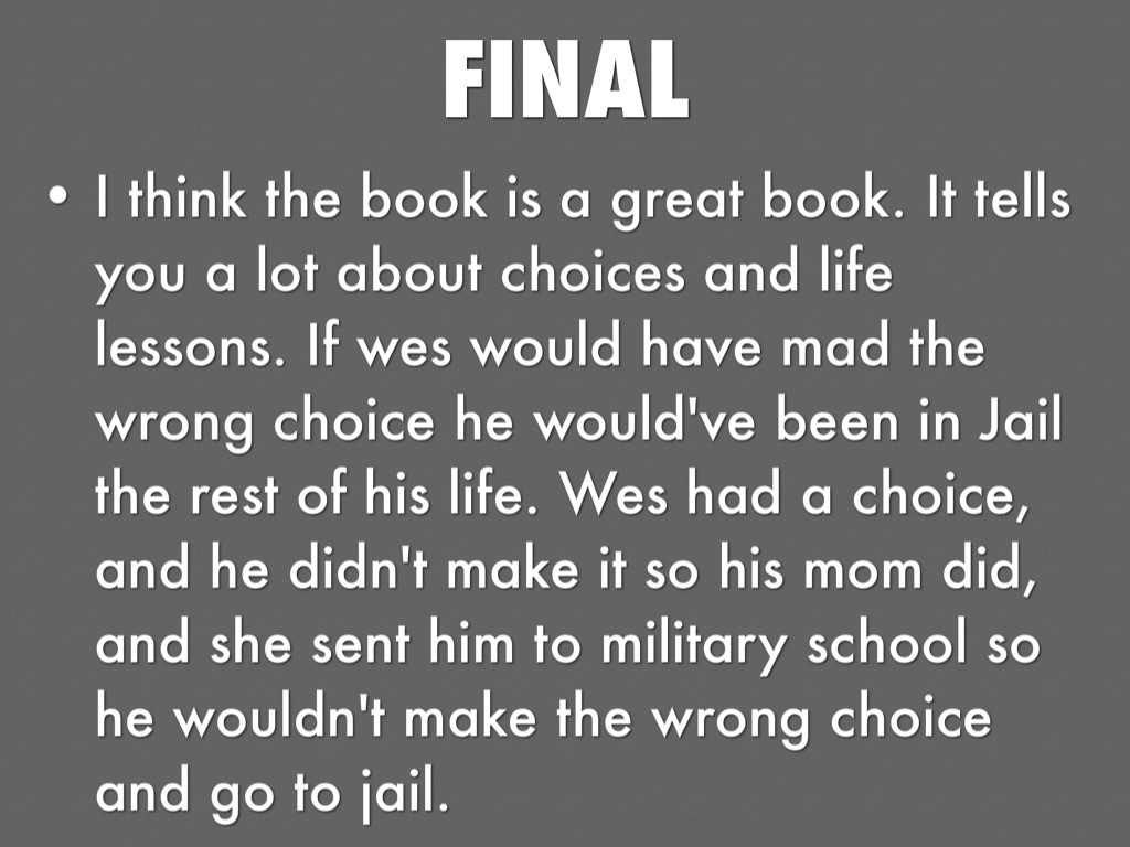 • I think the book is a great book. It tells you a lot about choices and life lessons. If wes would have mad the wrong choice he would've been in Jail the rest of his life. Wes had a choice, and he didn't make it so his mom did, and she sent him to military school so he wouldn't make the wrong choice and go to jail.
