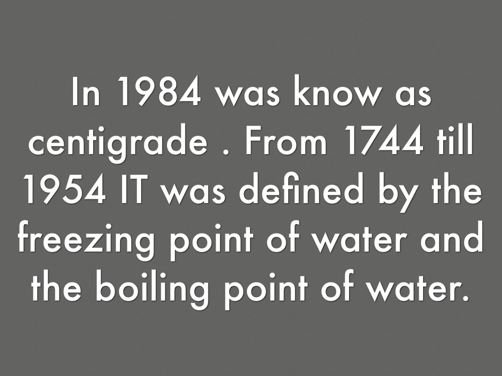 In 1984 was know as centigrade . From 1744 till 1954 IT was defined by the freezing point of water and the boiling point of water.