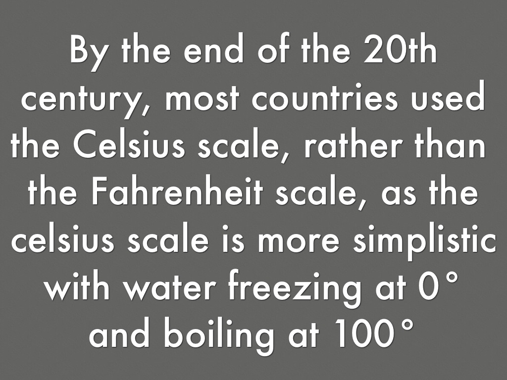 By the end of the 20th century, most countries used the Celsius scale, rather than the Fahrenheit scale, as the celsius scale is more simplistic with water freezing at 0° and boiling at 100°