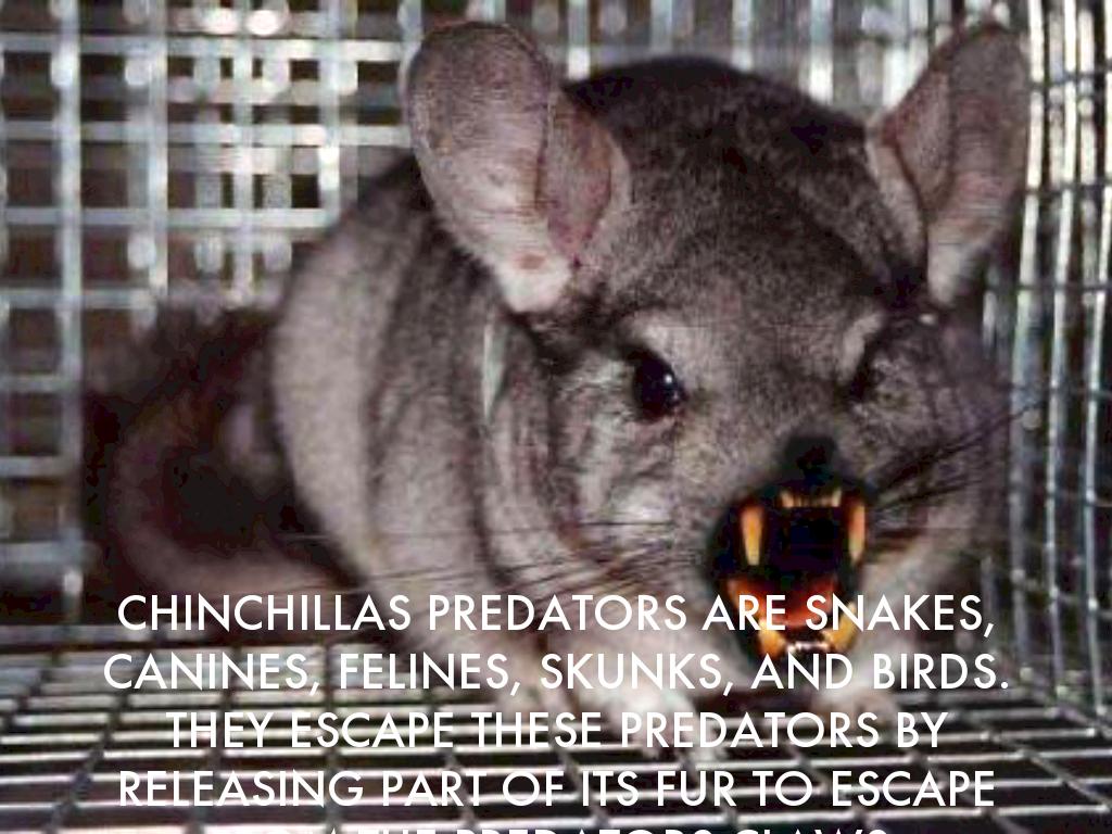 CHINCHILLAS PREDATORS ARE SNAKES, CANINES, FELINES, SKUNKS, AND BIRDS. THEY ESCAPE THESE PREDATORS BY RELEASING PART OF ITS FUR TO ESCAPE FROM THE PREDATORS CLAWS.