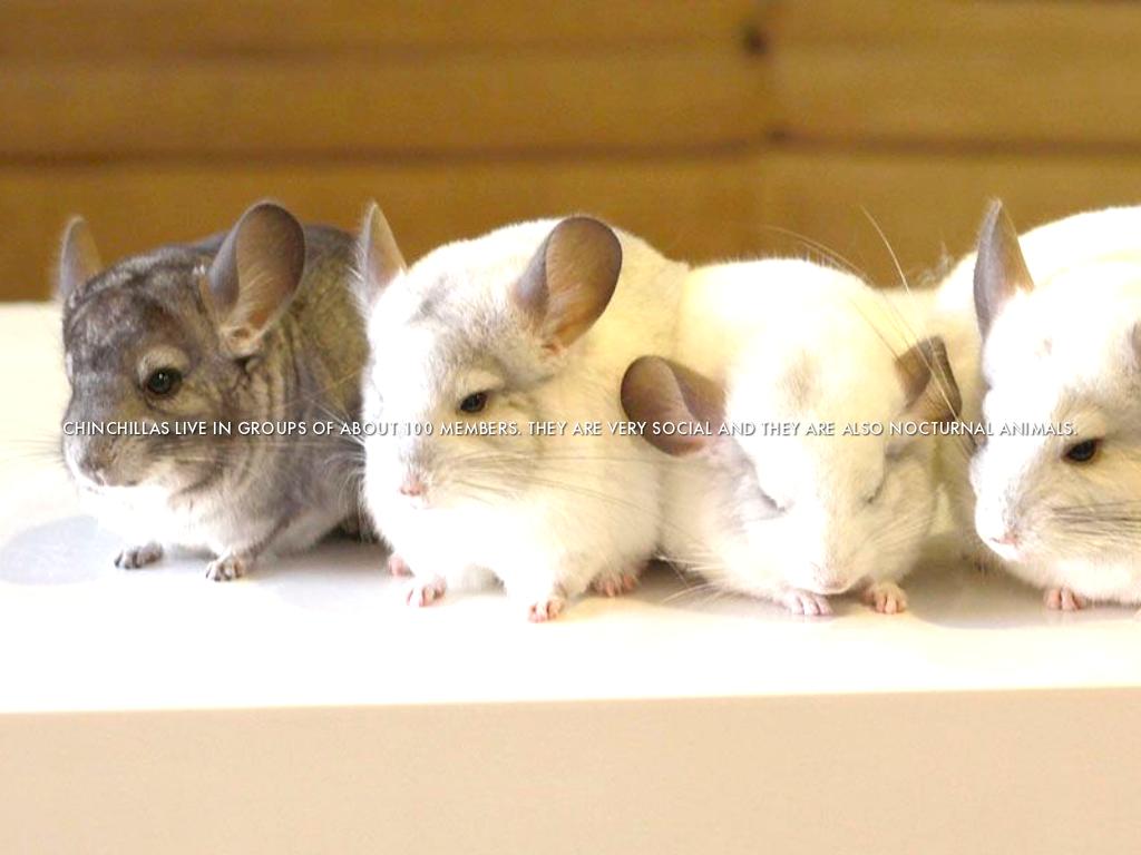 CHINCHILLAS LIVE IN GROUPS OF ABOUT 100 MEMBERS. THEY ARE VERY SOCIAL AND THEY ARE ALSO NOCTURNAL ANIMALS.