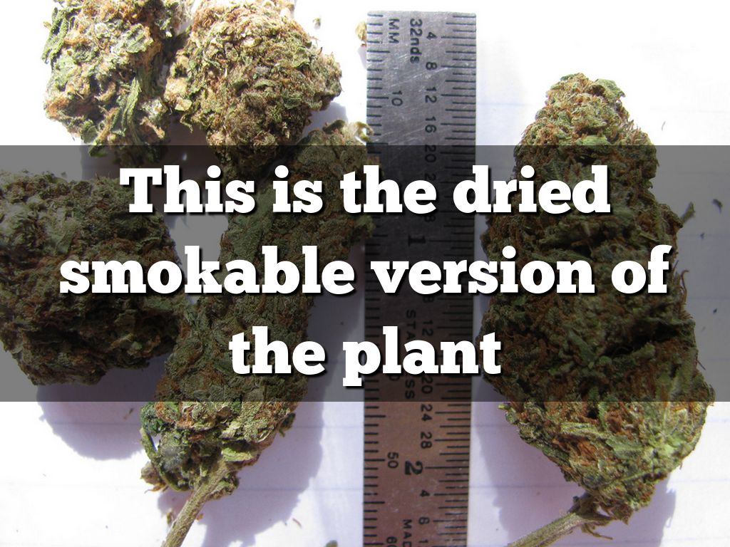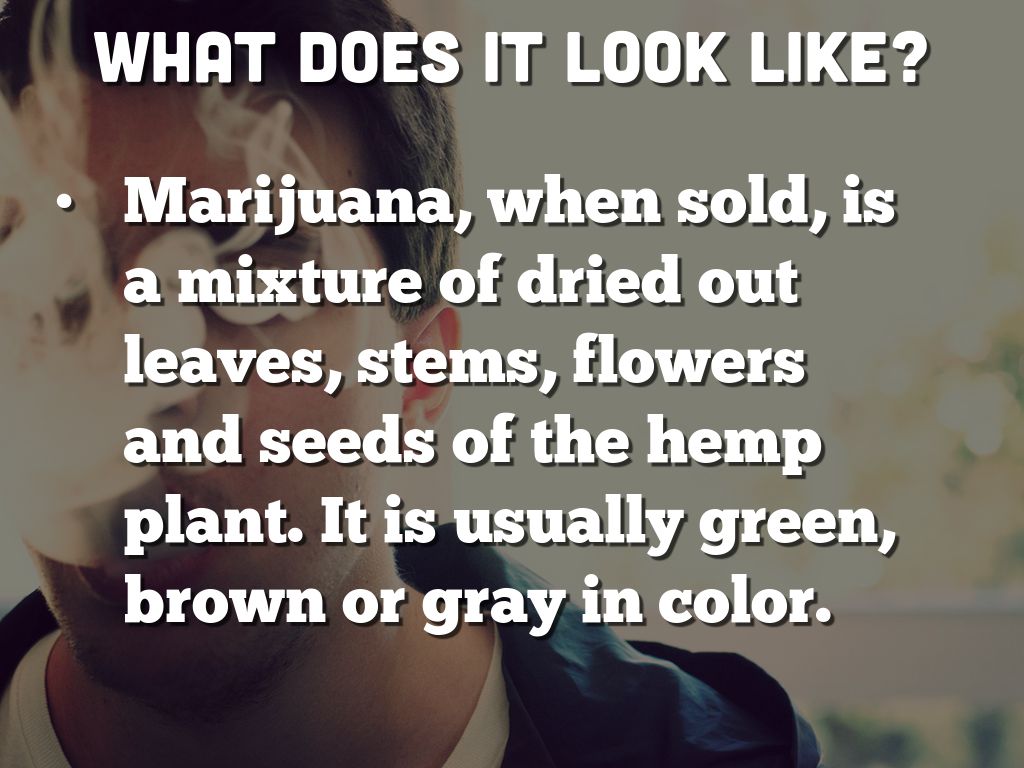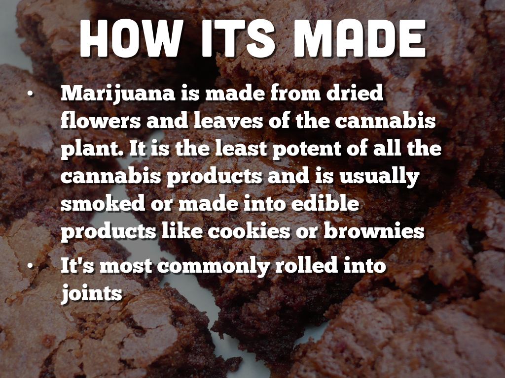 Marijuana is made from dried flowers and leaves of the cannabis plant. It is the least potent of all the cannabis products and is usually smoked or made into edible products like cookies or brownies