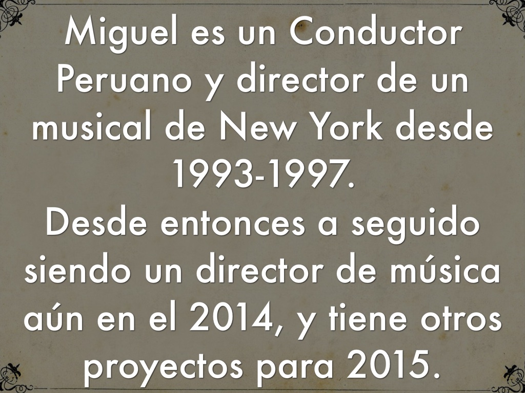 Miguel es un Conductor Peruano y director de un musical de New York desde 1993-1997. Desde entonces a seguido siendo un director de música aún en el 2014, y tiene otros proyectos para 2015.