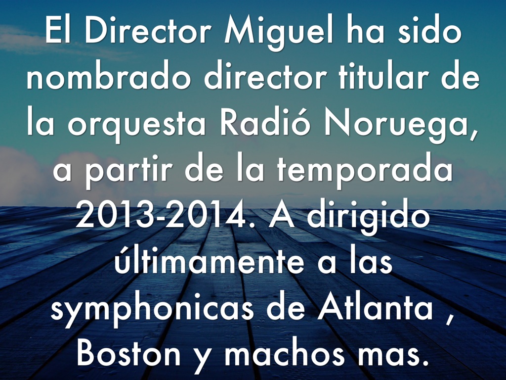 El Director Miguel ha sido nombrado director titular de la orquesta Radió Noruega, a partir de la temporada 2013-2014. A dirigido últimamente a las symphonicas de Atlanta , Boston y machos mas.