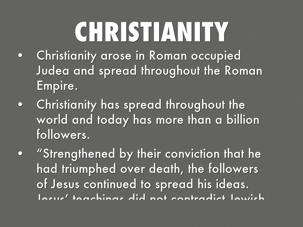 • Christianity arose in Roman occupied Judea and spread throughout the Roman Empire.