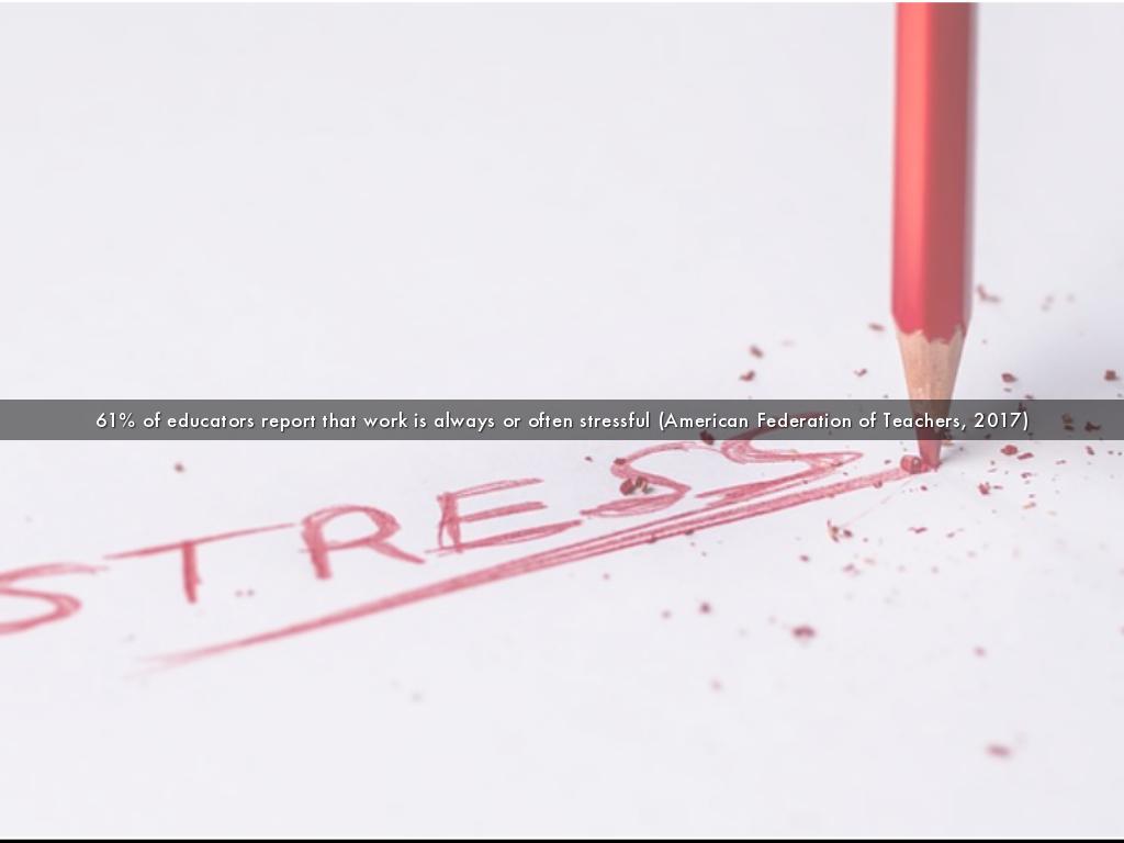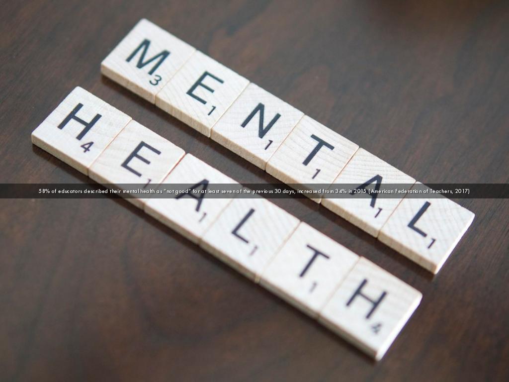 58% of educators described their mental health as “not good” for at least seven of the previous 30 days, increased from 34% in 2015 (American Federation of Teachers, 2017)