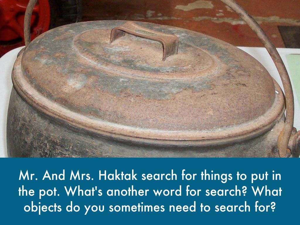 Mr. And Mrs. Haktak search for things to put in the pot. What's another word for search? What objects do you sometimes need to search for?