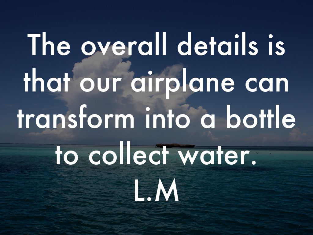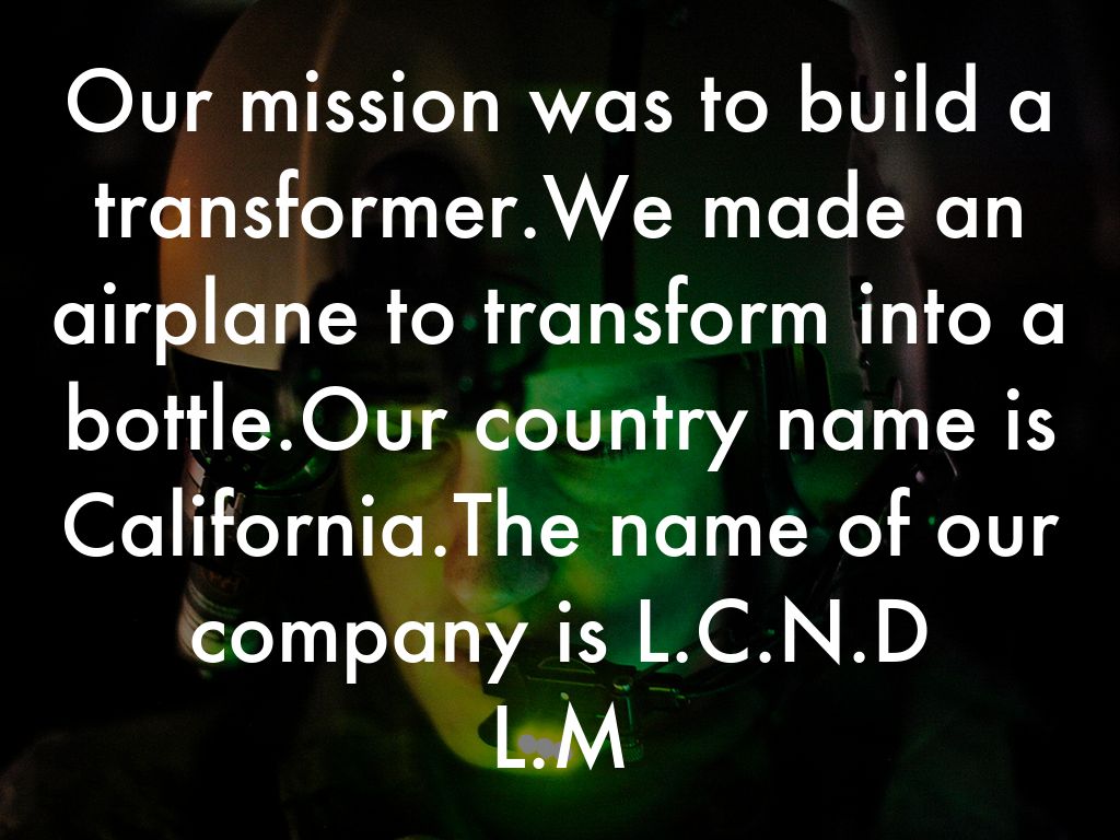 Our mission was to build a transformer.We made an airplane to transform into a bottle.Our country name is California.The name of our company is L.C.N.D