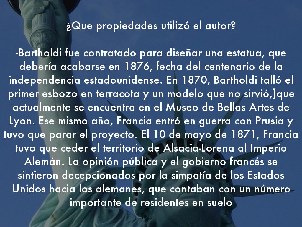 -Bartholdi fue contratado para diseñar una estatua, que debería acabarse en 1876, fecha del centenario de la independencia estadounidense. En 1870, Bartholdi talló el primer esbozo en terracota y un modelo que no sirvió,]​que actualmente se encuentra en el Museo de Bellas Artes de Lyon. Ese mismo año, Francia entró en guerra con Prusia y tuvo que parar el proyecto. El 10 de mayo de 1871, Francia tuvo que ceder el territorio de Alsacia-Lorena al Imperio Alemán. La opinión pública y el gobierno francés se sintieron decepcionados por la simpatía de los Estados Unidos hacia los alemanes, que contaban con un número importante de residentes en suelo