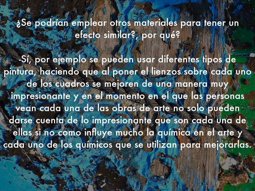 -Sí, por ejemplo se pueden usar diferentes tipos de pintura, haciendo que al poner el lienzos sobre cada uno de los cuadros se mejoren de una manera muy impresionante y en el momento en el que las personas vean cada una de las obras de arte no solo pueden darse cuenta de lo impresionante que son cada una de ellas si no como influye mucho la química en el arte y cada uno de los químicos que se utilizan para mejorarlas.
