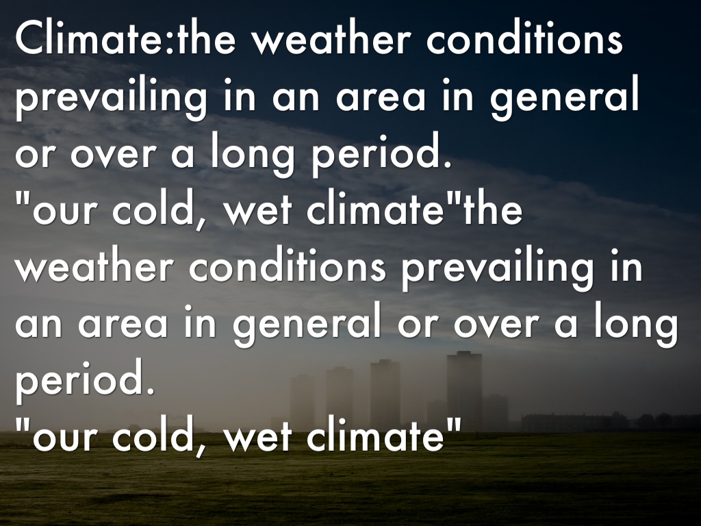 Climate:the weather conditions prevailing in an area in general or over a long period.