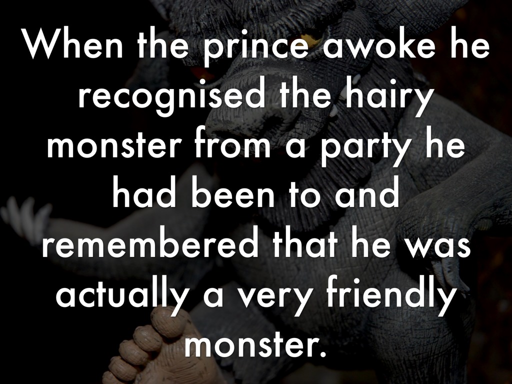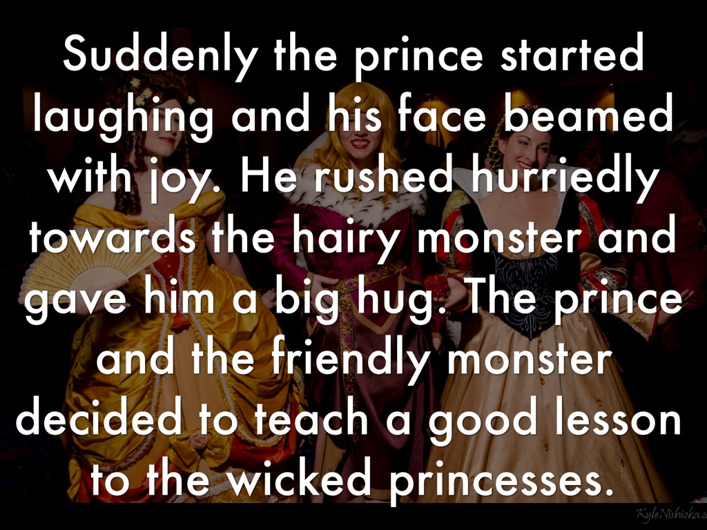 Suddenly the prince started laughing and his face beamed with joy. He rushed hurriedly towards the hairy monster and gave him a big hug. The prince and the friendly monster decided to teach a good lesson to the wicked princesses.