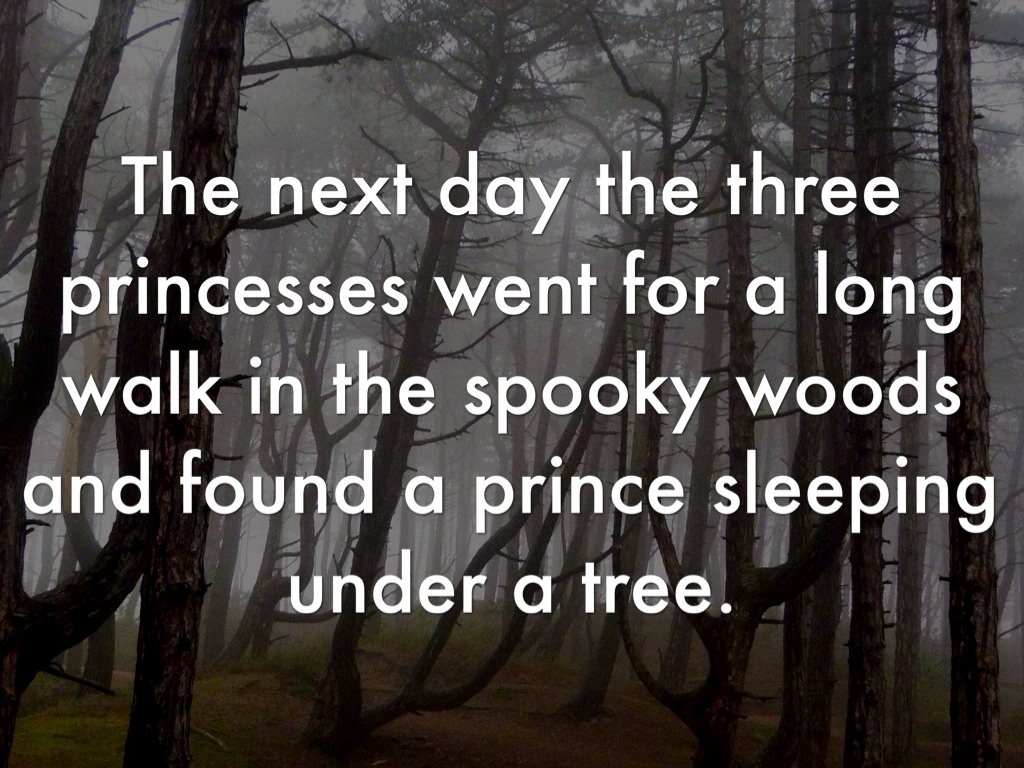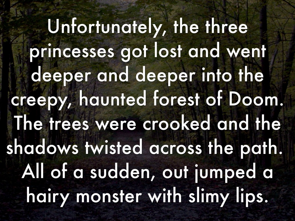Unfortunately, the three princesses got lost and went deeper and deeper into the creepy, haunted forest of Doom. The trees were crooked and the shadows twisted across the path. All of a sudden, out jumped a hairy monster with slimy lips.
