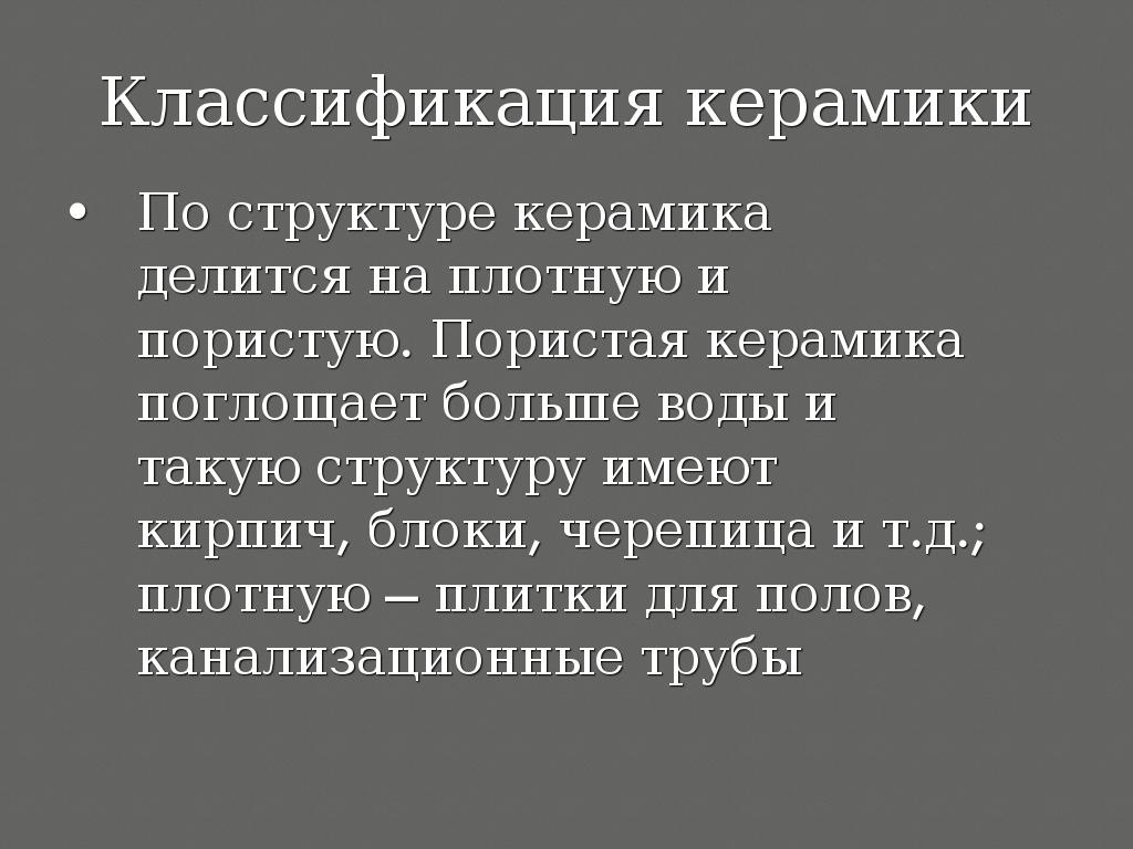 • По структуре керамика делится на плотную и пористую. Пористая керамика поглощает больше воды и такую структуру имеют кирпич, блоки, черепица и т.д.; плотную — плитки для полов, канализационные трубы