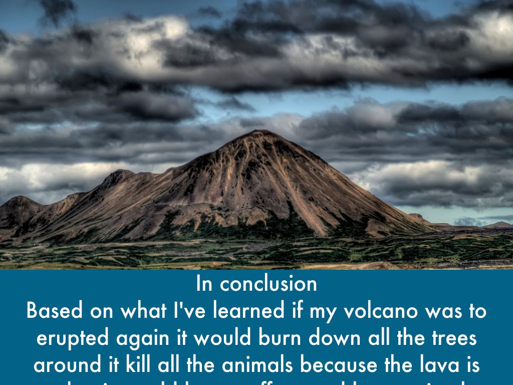 Based on what I've learned if my volcano was to erupted again it would burn down all the trees around it kill all the animals because the lava is so hot it would burn stuff up and burn animals alive