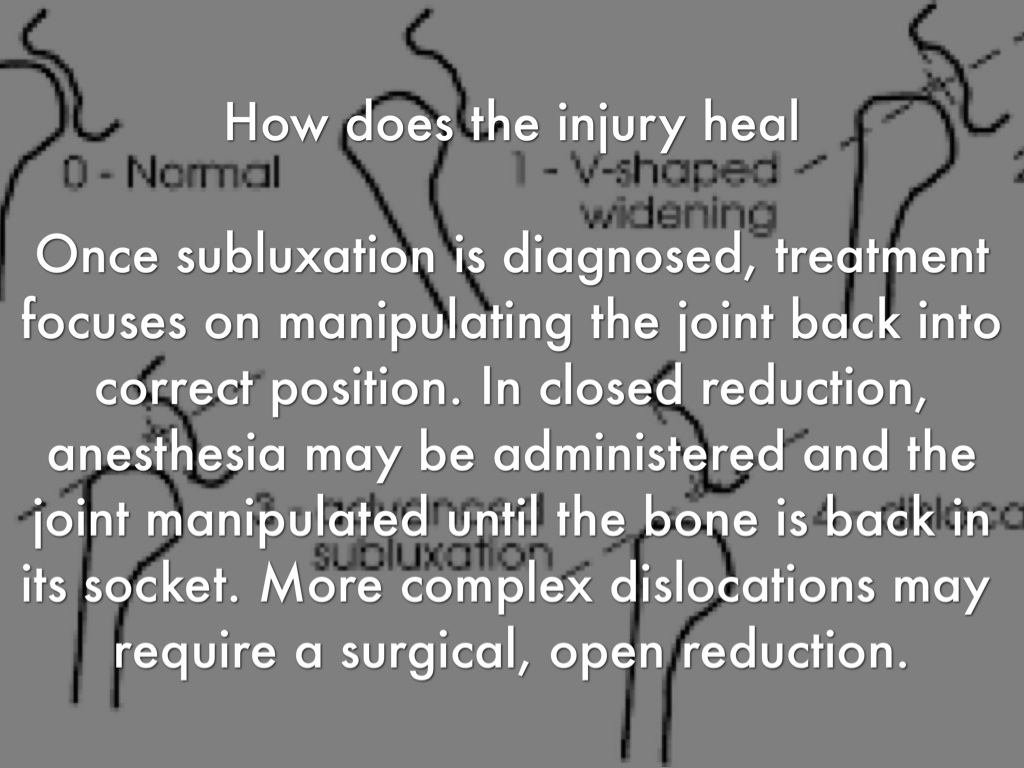 Once subluxation is diagnosed, treatment focuses on manipulating the joint back into correct position. In closed reduction, anesthesia may be administered and the joint manipulated until the bone is back in its socket. More complex dislocations may require a surgical, open reduction.