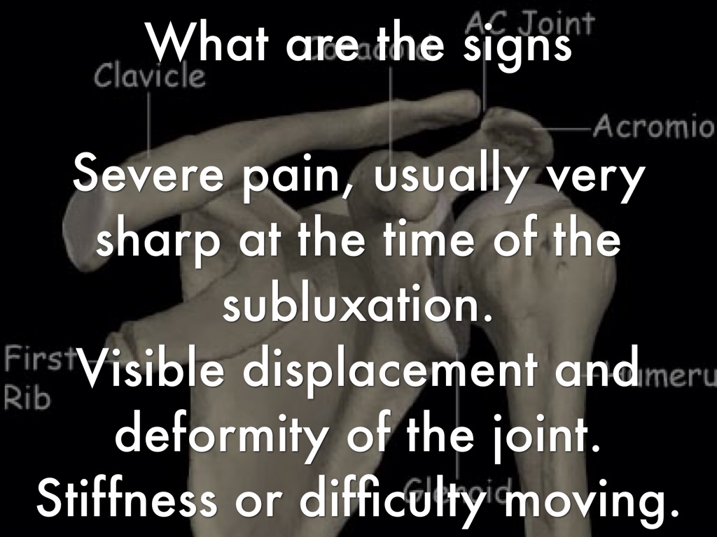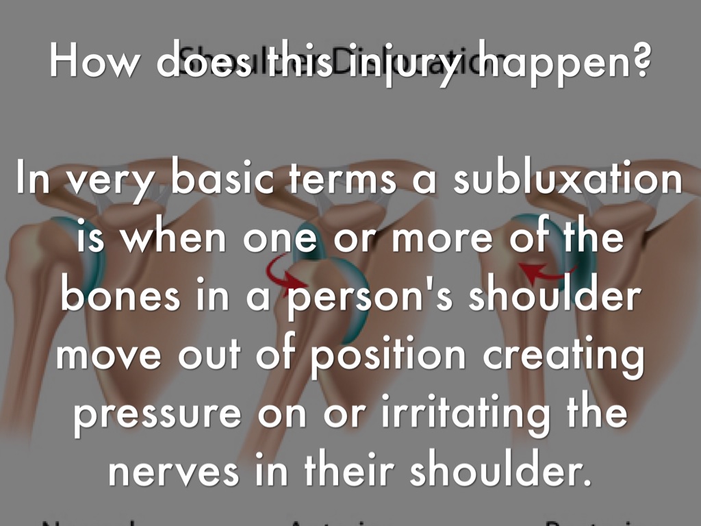 In very basic terms a subluxation is when one or more of the bones in a person's shoulder move out of position creating pressure on or irritating the nerves in their shoulder.