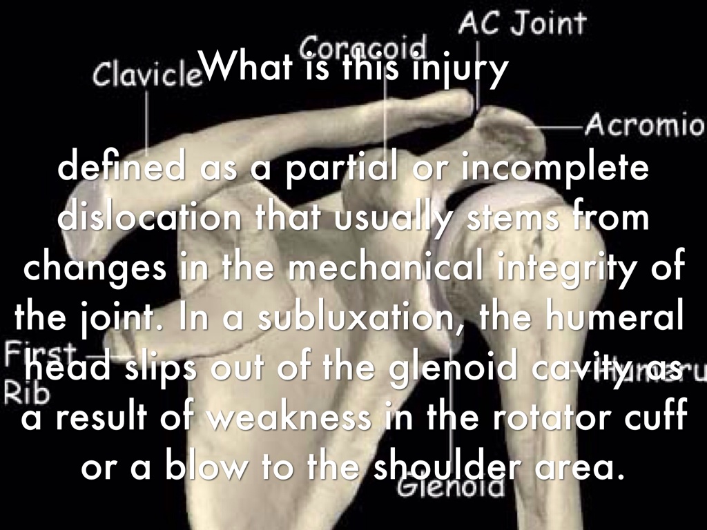 defined as a partial or incomplete dislocation that usually stems from changes in the mechanical integrity of the joint. In a subluxation, the humeral head slips out of the glenoid cavity as a result of weakness in the rotator cuff or a blow to the shoulder area.