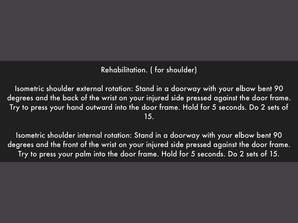 Isometric shoulder internal rotation: Stand in a doorway with your elbow bent 90 degrees and the front of the wrist on your injured side pressed against the door frame. Try to press your palm into the door frame. Hold for 5 seconds. Do 2 sets of 15.