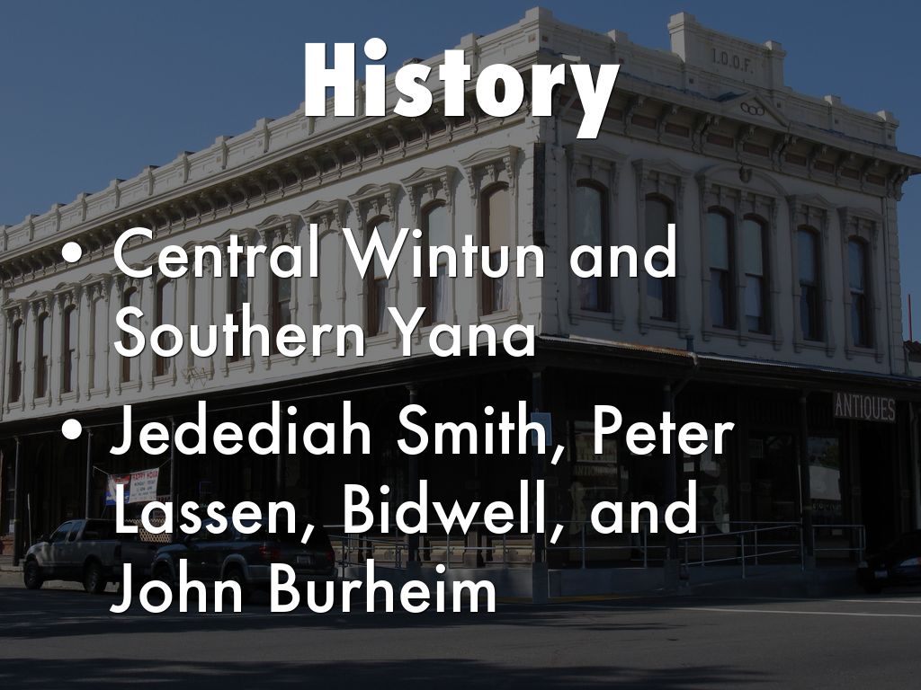 On April 10, 1828, Jedediah Smith passed through on the way to Oregon. In 1843 Peter Lassen, John Bidwell, and John Burheim came in pursuit of horse thieves