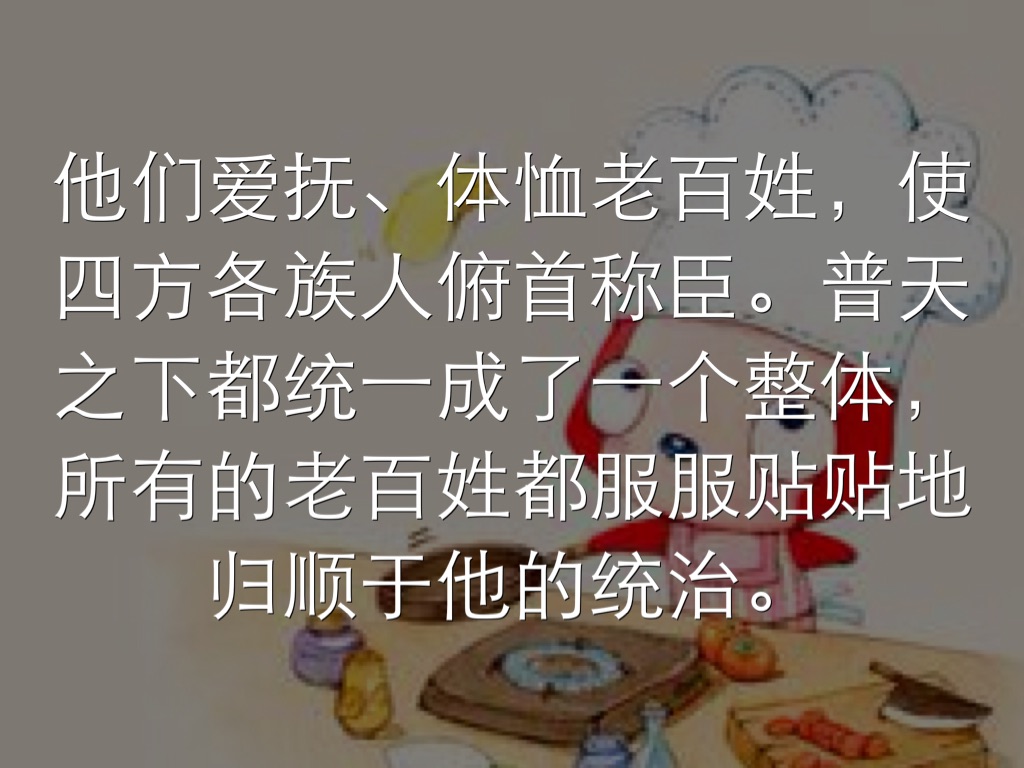 他们爱抚、体恤老百姓,使四方各族人俯首称臣。普天之下都统一成了一个整体,所有的老百姓都服服贴贴地归顺于他的统治。