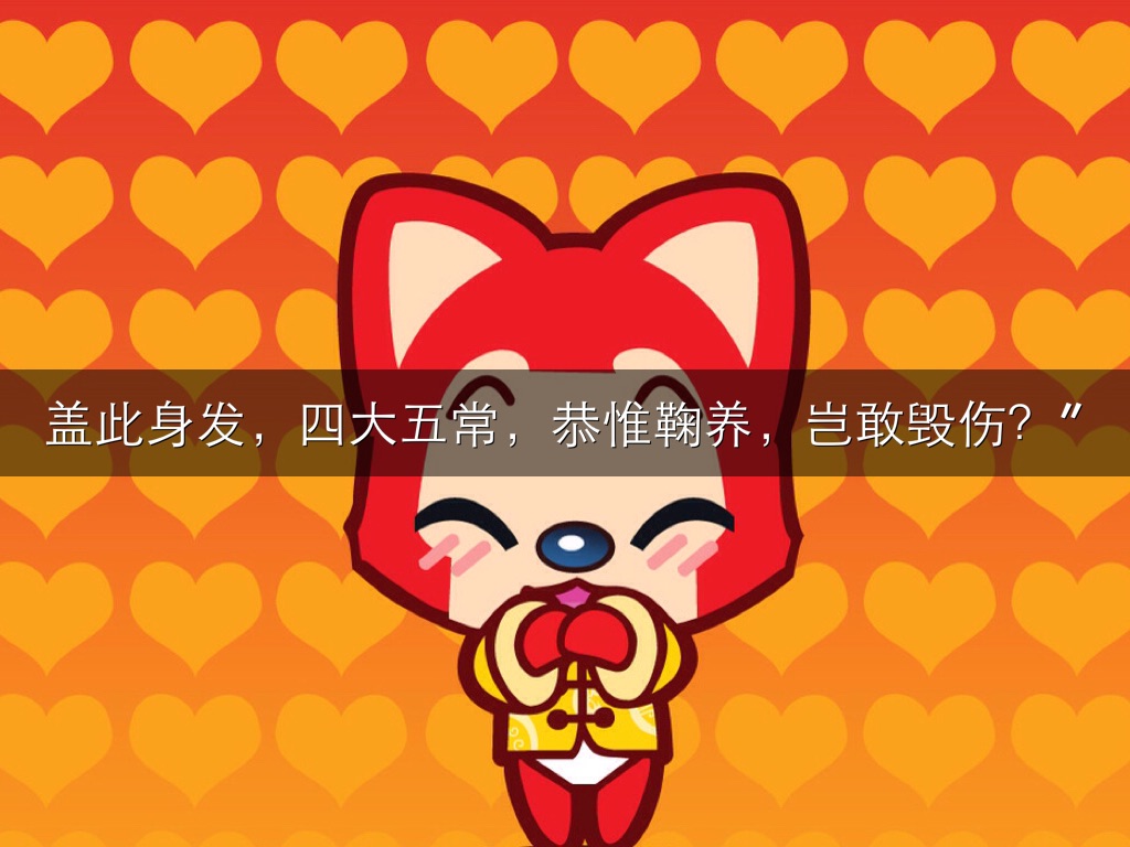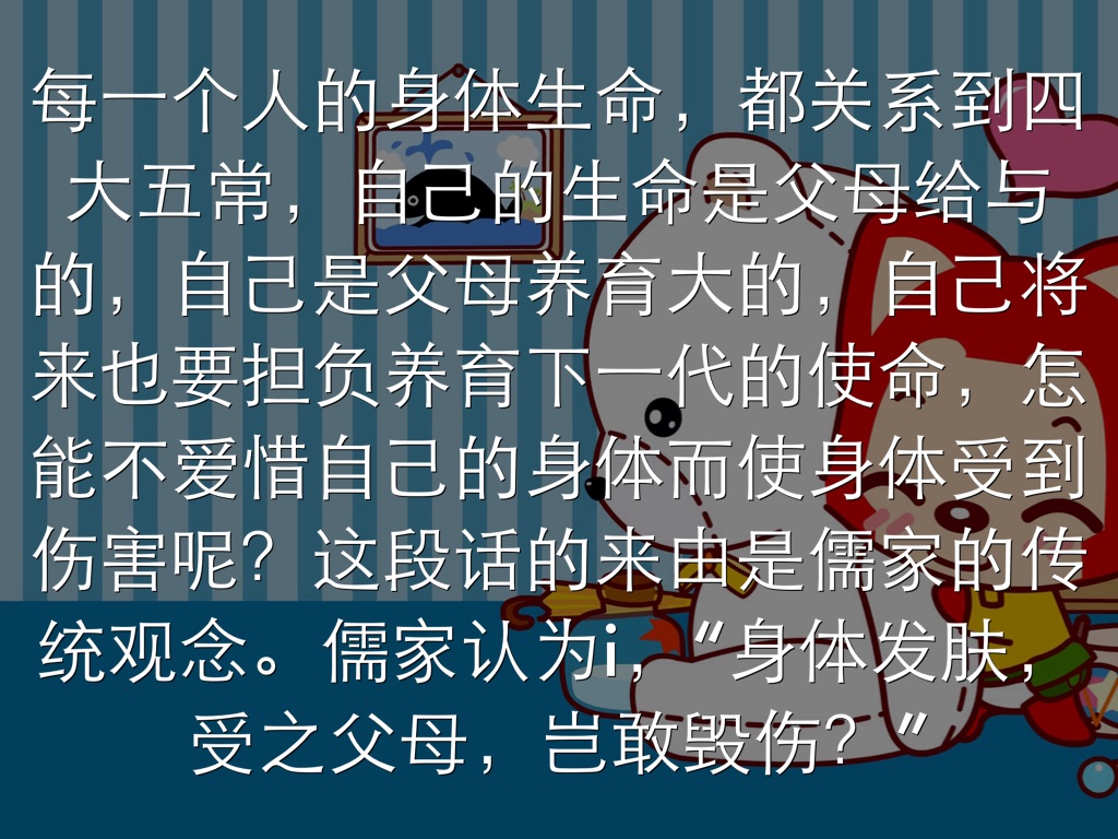 每一个人的身体生命,都关系到四大五常,自己的生命是父母给与的,自己是父母养育大的,自己将来也要担负养育下一代的使命,怎能不爱惜自己的身体而使身体受到伤害呢?这段话的来由是儒家的传统观念。儒家认为i,“身体发肤,受之父母,岂敢毁伤?”