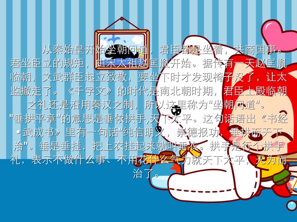 从秦始皇开始坐朝问道,君臣都是坐着,共商国事。君坐臣立的规矩,由宋太祖赵匡胤开始。据传有一天赵匡胤临朝,文武群臣起立致敬,要坐下时才发现椅子没了,让太监撤走了。《千字文》的时代是南北朝时期,君臣上殿临朝之礼还是沿用秦汉之制,所以这里称为"坐朝问道"。