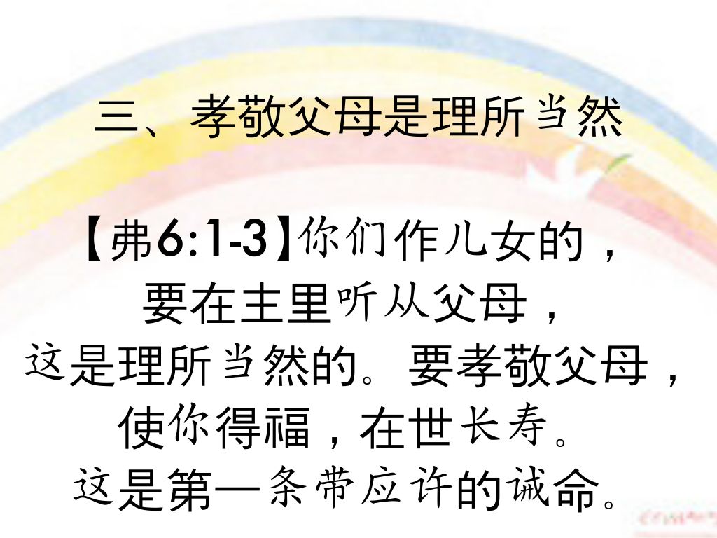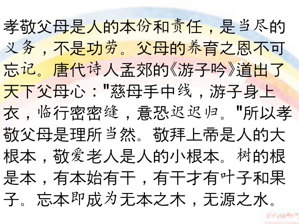 孝敬父母是人的本份和责任,是当尽的义务,不是功劳。父母的养育之恩不可忘记。唐代诗人孟郊的《游子吟》道出了天下父母心:"慈母手中线,游子身上衣,临行密密缝,意恐迟迟归。"所以孝敬父母是理所当然。敬拜上帝是人的大根本,敬爱老人是人的小根本。树的根是本,有本始有干,有干才有叶子和果子。忘本即成为无本之木,无源之水。