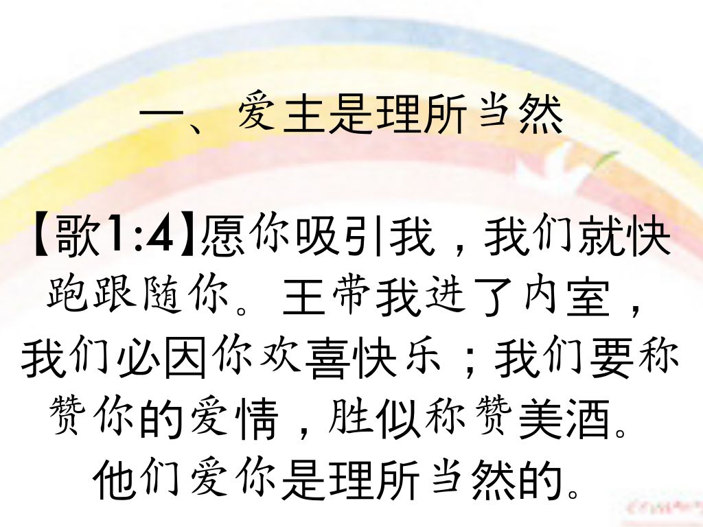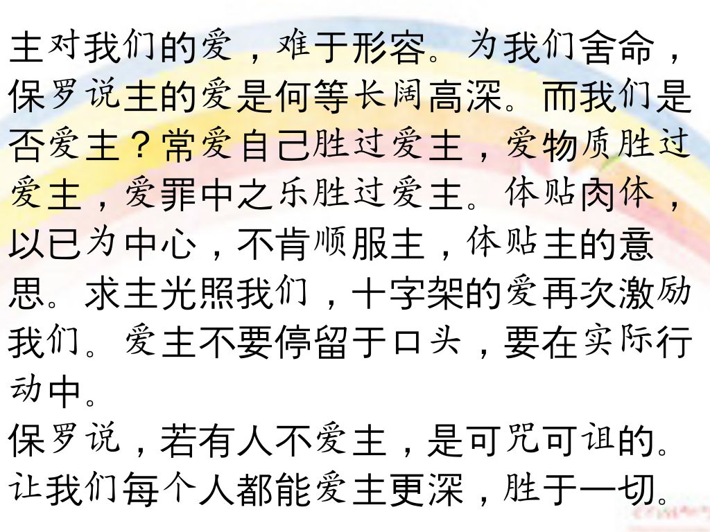 保罗说主的爱是何等长阔高深。而我们是否爱主?常爱自己胜过爱主,爱物质胜过爱主,爱罪中之乐胜过爱主。体贴肉体,