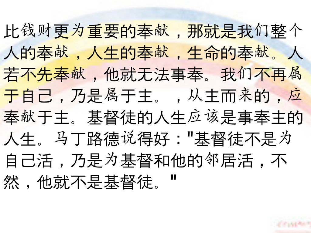 比钱财更为重要的奉献,那就是我们整个人的奉献,人生的奉献,生命的奉献。人若不先奉献,他就无法事奉。我们不再属于自己,乃是属于主。,从主而来的,应奉献于主。基督徒的人生应该是事奉主的人生。马丁路德说得好:"基督徒不是为自己活,乃是为基督和他的邻居活,不然,他就不是基督徒。"