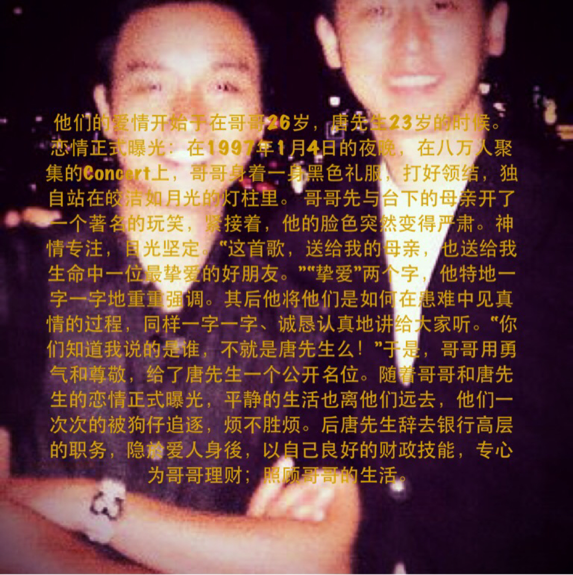 葬礼是唐先生以未亡人的身份,忍着悲痛一手操办的,安排葬礼程序、来宾,丝丝不苟。在哥哥的讣告上,唐先生以“挚爱”的身份排在头位,他们长达20年坚贞的恋情终受到了亲友一致尊重。哥哥的外甥女在葬礼上拿着话筒对唐先生讲:“Uncle Daffy,舅父一直好珍惜和你的感情。他说你曾借了几个月薪水让他渡过难关。过去一年,我也看到什么叫做真爱。你对(患抑郁症的)十舅父不离不弃,日以继夜照顾他。Uncle Daffy,我代表十舅父多谢你!十舅父有你,好幸福。无论我们有多伤心,我相信不会及你伤心。舅父假如不舍离开我们,我相信他心里最不舍的一个人是你。”唐先生送给哥哥的白色花圈的题词:“夜阑静,有谁共鸣…… ”“阿仔,天长地久有时尽,此爱绵绵无绝期。”