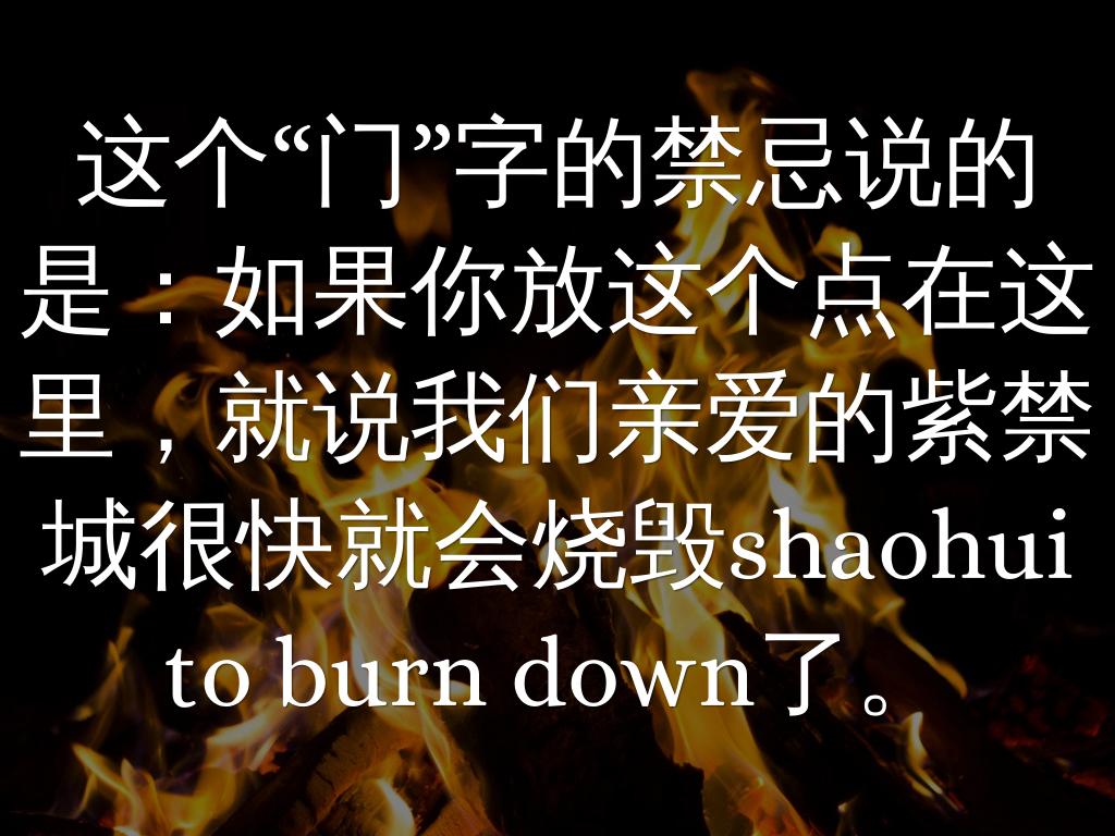 这个“门”字的禁忌说的是:如果你放这个点在这里,就说我们亲爱的紫禁城很快就会烧毁shaohui to burn down了。