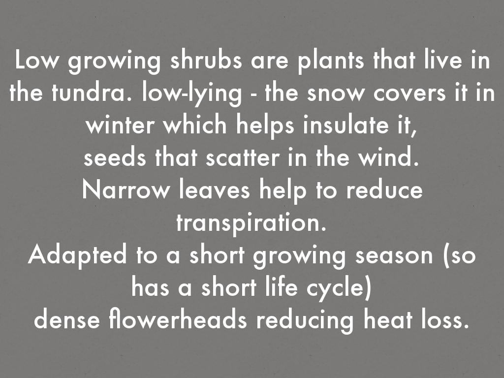 Low growing shrubs are plants that live in the tundra. low-lying - the snow covers it in winter which helps insulate it,