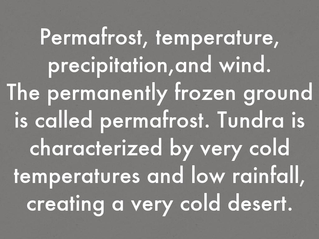 The permanently frozen ground is called permafrost. Tundra is characterized by very cold temperatures and low rainfall, creating a very cold desert.