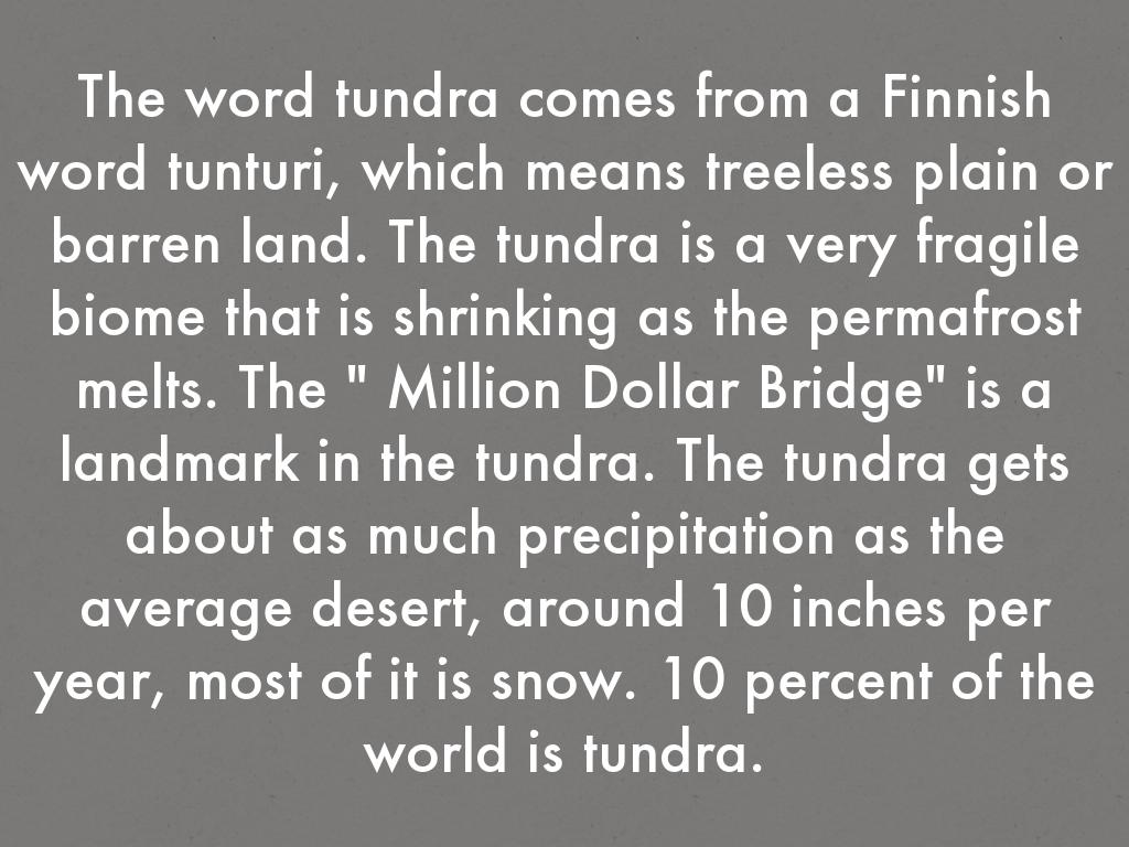 The word tundra comes from a Finnish word tunturi, which means treeless plain or barren land. The tundra is a very fragile biome that is shrinking as the permafrost melts. The " Million Dollar Bridge" is a landmark in the tundra. The tundra gets about as much precipitation as the average desert, around 10 inches per year, most of it is snow. 10 percent of the world is tundra.