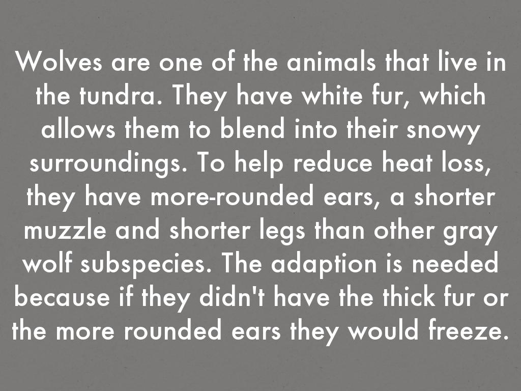 Wolves are one of the animals that live in the tundra. They have white fur, which allows them to blend into their snowy surroundings. To help reduce heat loss, they have more-rounded ears, a shorter muzzle and shorter legs than other gray wolf subspecies. The adaption is needed because if they didn't have the thick fur or the more rounded ears they would freeze.