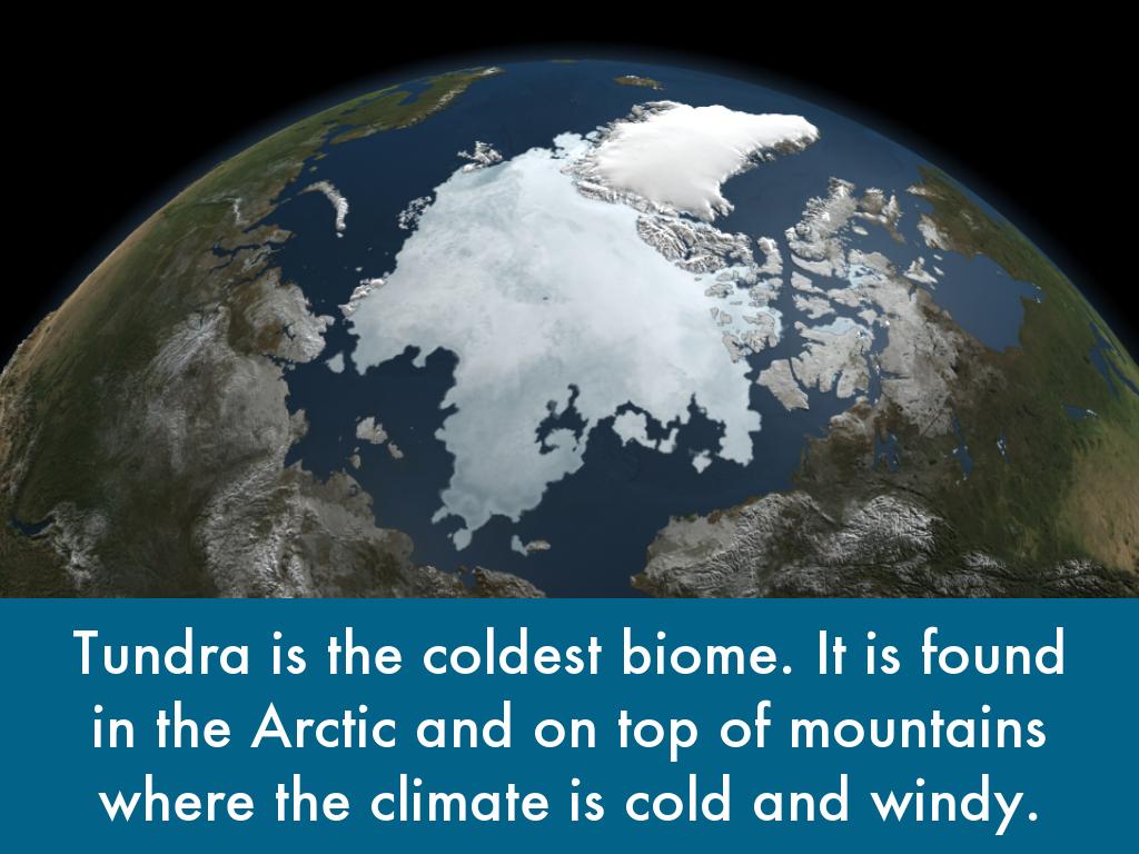 Tundra is the coldest biome. It is found in the Arctic and on top of mountains where the climate is cold and windy.