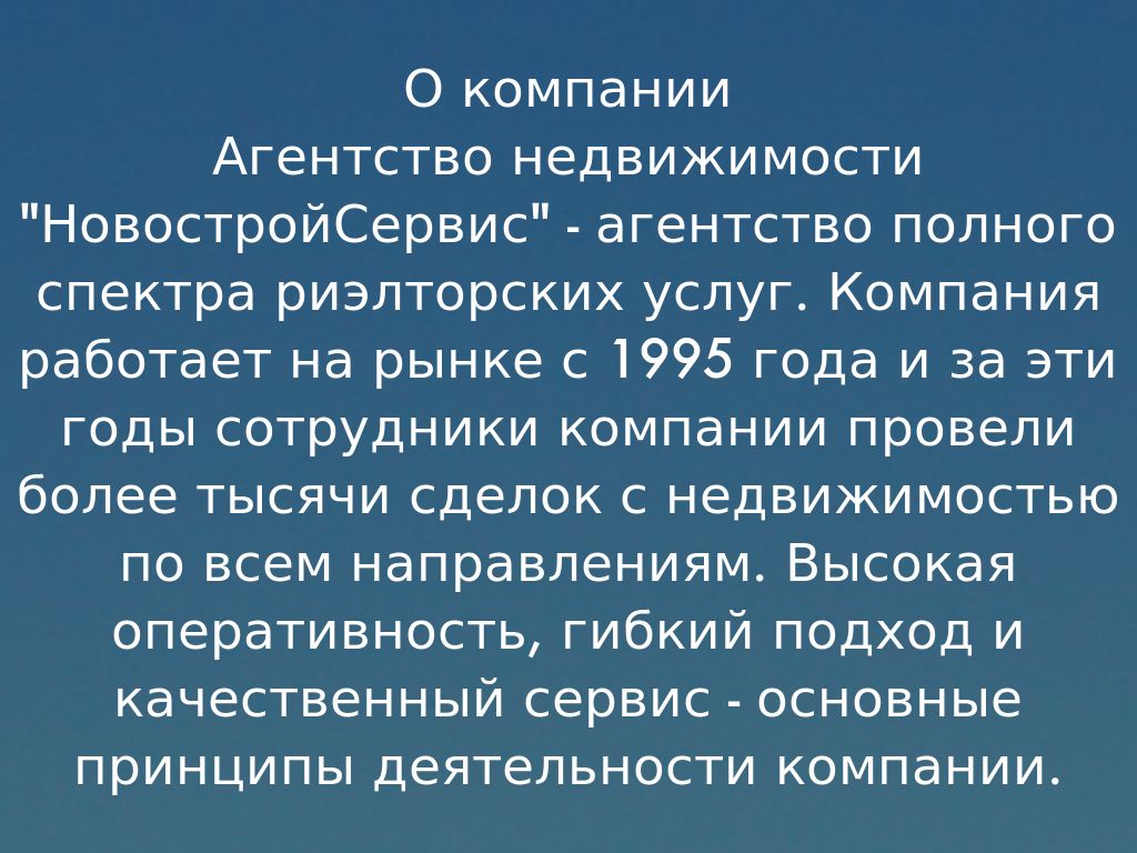 О компании Агентство недвижимости "НовостройСервис" - агентство полного спектра риэлторских услуг. Компания работает на рынке с 1995 года и за эти годы сотрудники компании провели более тысячи сделок с недвижимостью по всем направлениям. Высокая оперативность, гибкий подход и качественный сервис - основные принципы деятельности компании.