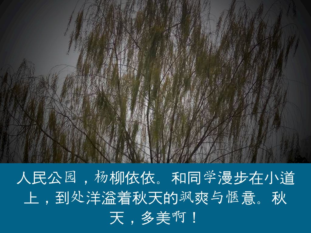 人民公园,杨柳依依。和同学漫步在小道上,到处洋溢着秋天的飒爽与惬意。秋天,多美啊!