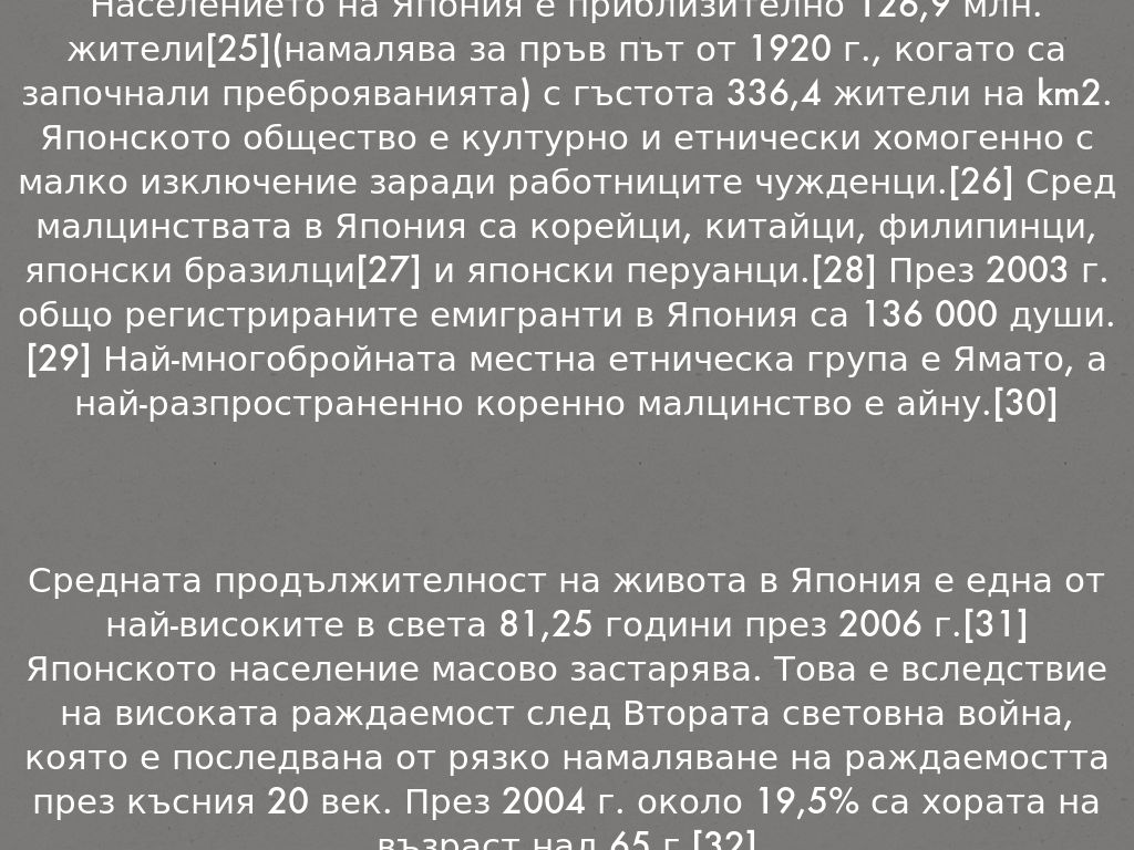 Населението на Япония е приблизително 126,9 млн. жители[25](намалява за пръв път от 1920 г., когато са започнали преброяванията) с гъстота 336,4 жители на km2. Японското общество е културно и етнически хомогенно с малко изключение заради работниците чужденци.[26] Сред малцинствата в Япония са корейци, китайци, филипинци, японски бразилци[27] и японски перуанци.[28] През 2003 г. общо регистрираните емигранти в Япония са 136 000 души.[29] Най-многобройната местна етническа група е Ямато, а най-разпространенно коренно малцинство е айну.[30]