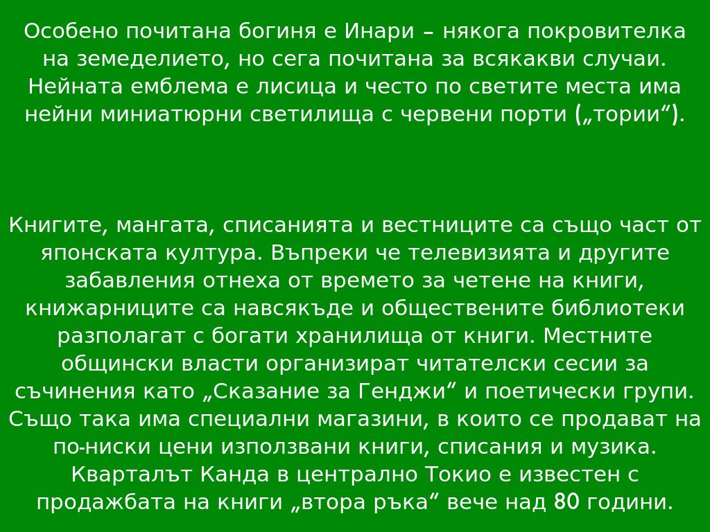 Книгите, мангата, списанията и вестниците са също част от японската култура. Въпреки че телевизията и другите забавления отнеха от времето за четене на книги, книжарниците са навсякъде и обществените библиотеки разполагат с богати хранилища от книги. Местните общински власти организират читателски сесии за съчинения като „Сказание за Генджи“ и поетически групи. Също така има специални магазини, в които се продават на по-ниски цени използвани книги, списания и музика. Кварталът Канда в централно Токио е известен с продажбата на книги „втора ръка“ вече над 80 години.
